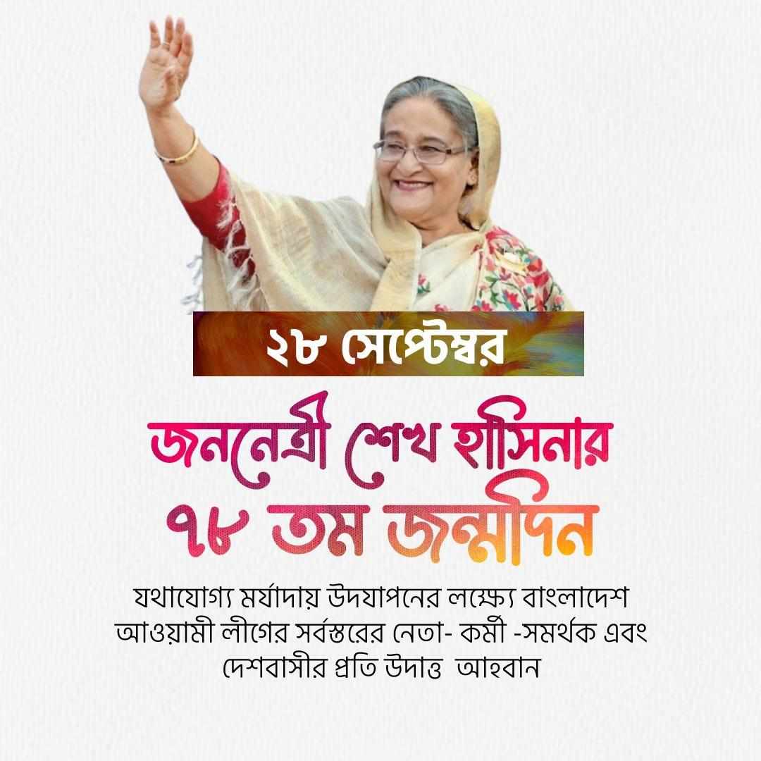 আগামী ২৮ সেপ্টেম্বর,২০২৪ জাতির জনক বঙ্গবন্ধু শেখ মুজিবুর রহমানের কন্যা, বাংলাদেশের সফল প্রধানমন্ত্রী, বাংলাদেশ আওয়ামী লীগের সংগ্রামী সভাপতি, দেশের গরীব- দুঃখী-মেহনতি মানুষের শেষ আশ্রয়স্থল জননেত্রী শেখ হাসিনার ৭৮ তম জন্মদিন যথাযোগ্য মর্যাদায় উদযাপনের লক্ষ্যে বাংলাদেশ আওয়ামী লীগের সর্বস্তরের নেতা- কর্মী -সমর্থক এবং দেশবাসীর প্রতি উদাত্ত আহবান জানানো হচ্ছে।