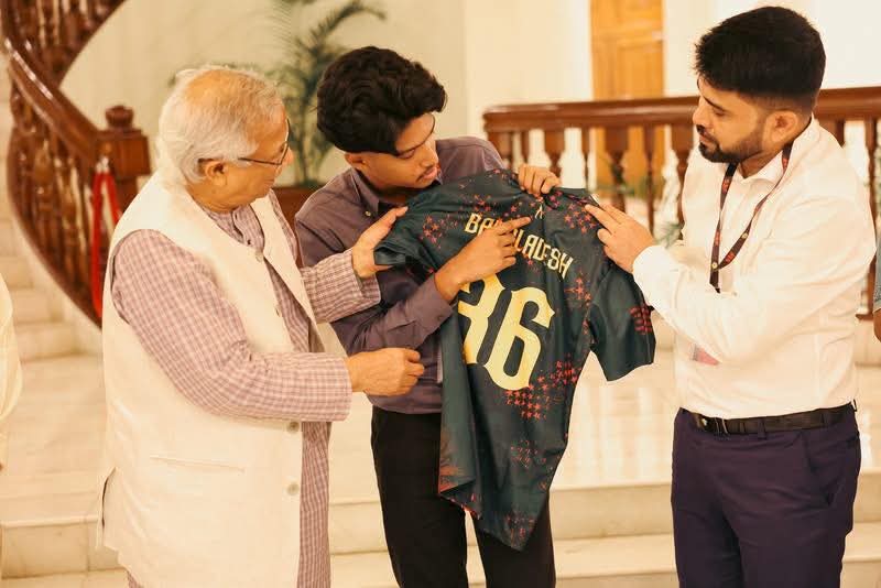 এসময় মেঘ তার নিজের ডিজাইন করা এরা একটি জার্সি ও ব্যাগ প্রধান উপদেষ্টাকে উপহার দেন।