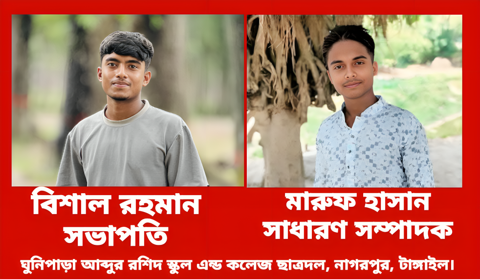 আজ ২৫ আগস্ট'২৫ রবিবার উক্ত বিষয়টি উপজেলা ছাত্রদলের সংগ্রামী আহবায়ক মীর খালিদ মাহবুব রাসেল ও বিপ্লবী সদস্য সচিব মোঃ শহিদুর রহমান মনির গণমাধ্যমকে নিশ্চিত করে বলেন - নাগরপুর ঘুনিপাড়া আব্দুর রশিদ স্কুল এন্ড কলেজ ছাত্রদলের সভাপতি হিসাবে বিশাল রহমান ও সাধারণ সম্পাদক হিসাবে মারুফ হাসান এর নাম অনুমোদিত হয়েছে।