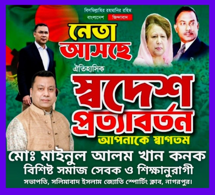 উক্ত ঐতিহাসিক স্বদেশ প্রত্যাবর্তনে সফর সঙ্গী হচ্ছেন মহান স্বাধীনতার ঘোষক শহীদ রাষ্ট্রপতি জিয়াউর রহমানের প্রতিষ্ঠিত জাতীয়তাবাদী আদর্শে বিশ্বাসী উদীয়মান তরুণ মেধাবী নেতৃত্ব, নাগরপুরের কৃতিসন্তান, বিশিষ্ট সমাজসেবক ও শিক্ষানুরাগী জননেতা মোঃ মাইনুল আলম খান কনক।