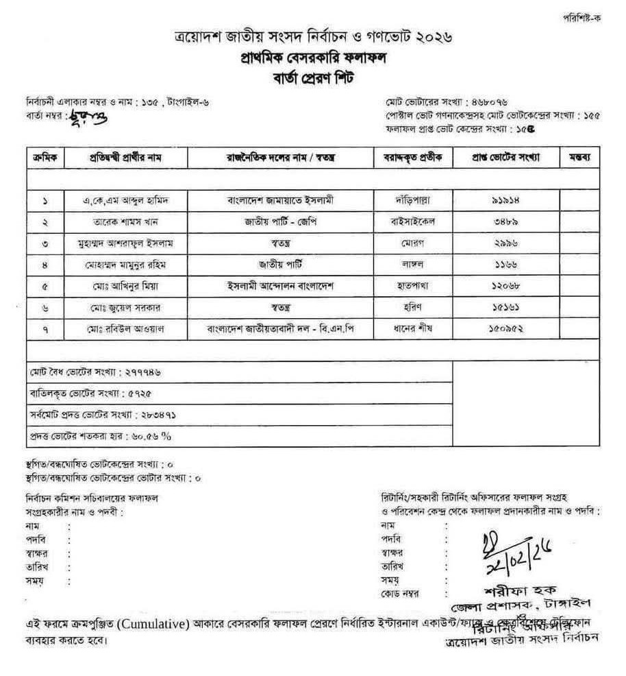 নিজস্ব প্রতিবেদক: ত্রয়োদশ জাতীয় সংসদ নির্বাচনে টাঙ্গাইল-৬ (নাগরপুর-দেলদুয়ার) আসনে বেসরকারি ফলাফলে ধানের শীষ প্রতীকের প্রার্থী বর্ষীয়ান রাজনীতিবিদ জননেতা রবিউল আওয়াল লাভলু বড় ব্যবধানে বিজয় অর্জন করেছেন।