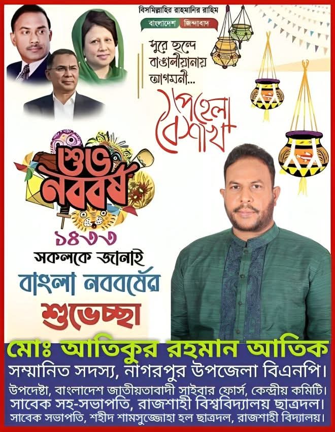 বাঙালির প্রাণের এই উৎসব উপলক্ষে নাগরপুর দেলদুয়ারবাসী সহ সকল বাঙালিকে আন্তরিক শুভেচ্ছা ও অভিনন্দন জানিয়েছেন দক্ষিন টাঙ্গাইলের কৃতি সন্তান, মহান স্বাধীনতার ঘোষক শহীদ রাষ্ট্রপতি জিয়াউর রহমানের প্রতিষ্ঠিত জাতীয়তাবাদী আদর্শে বিশ্বাসী রাজপথের লড়াকু সৈনিক, রাজশাহী বিশ্ববিদ্যালয় ছাত্রদলের সাবেক সফল সহ-সভাপতি, শহীদ শামসুজ্জোহা হল ছাত্রদল রাজশাহী বিশ্ববিদ্যালয়ের সাবেক সভাপতি, বাংলাদেশ জাতীয়তাবাদী সাইবার ফোর্স কেন্দ্রীয় কমিটির উপদেষ্টা, বাংলাদেশ জাতীয়তাবাদী দল (বিএনপি) নাগরপুর উপজেলা শাখার অন্যতম সদস্য, নাগরপুর দেলদুয়ারের গণমানুষের নেতা, বিশিষ্ট সমাজসেবক ও শিক্ষানুরাগী জননেতা মোঃ আতিকুর রহমান আতিক।