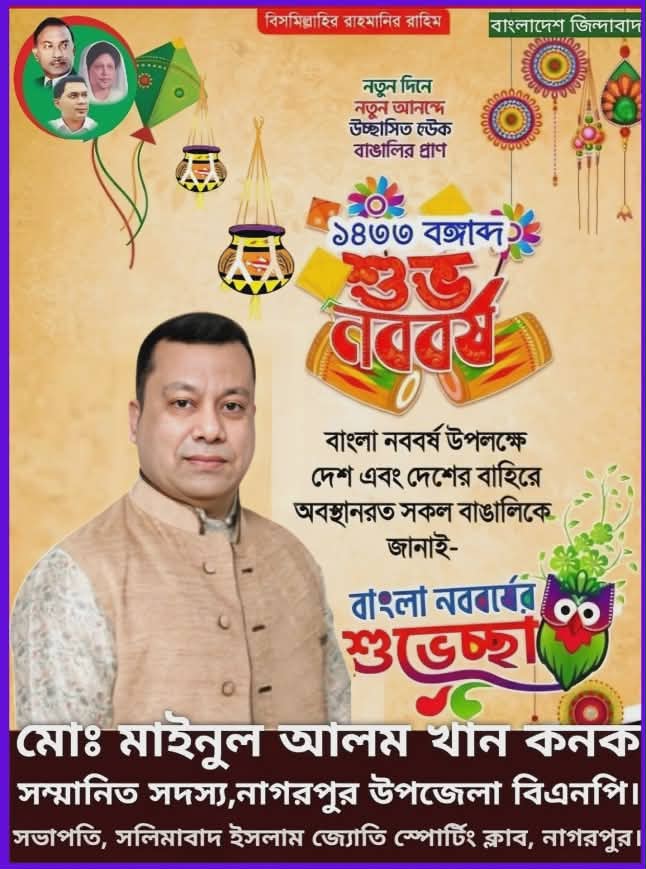 বাঙালির প্রাণের এই উৎসব উপলক্ষে নাগরপুর দেলদুয়ারবাসী সহ সকল বাঙালিকে আন্তরিক শুভেচ্ছা ও অভিনন্দন জানিয়েছেন দক্ষিণ টাঙ্গাইলের কৃতি সন্তান, মহান স্বাধীনতার ঘোষক শহীদ রাষ্ট্রপতি জিয়াউর রহমানের প্রতিষ্ঠিত জাতীয়তাবাদী আদর্শে বিশ্বাসী পরিবার থেকে বেড়ে ওঠা উদীয়মান তরুণ মেধাবী নেতৃত্ব, তরুণ প্রজন্মের অহংকার, বিশিষ্ট সমাজ সেবক ও শিক্ষানুরাগী, বাংলাদেশের জাতীয়তাবাদী দল বিএনপি নাগরপুর উপজেলা শাখার সম্মানিত সদস্য জননেতা মোঃ মাইনুল আলম খান কনক।
