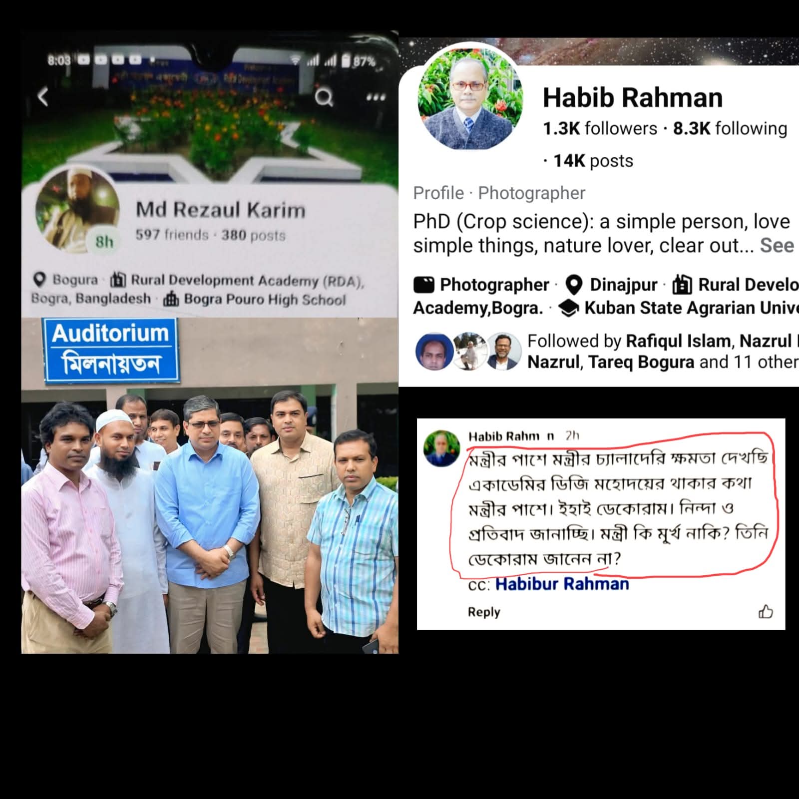 বিশেষজ্ঞদের মতে, "ডেকোরাম" নিয়ে মতামত থাকতে পারে, কিন্তু সেই মতামত প্রকাশের ভাষা হতে হবে শালীন ও সম্মানজনক। একজন জনপ্রতিনিধিকে "মূর্খ" বলে সম্বোধন করা শুধু অরুচিকরই নয়, এটি সামাজিক সৌজন্যবোধেরও পরিপন্থী। স্থানীয় মহলের অভিযোগ, হাবিব রহমান অবসর গ্রহণের পরও মাঝেমধ্যে একাডেমীতে এসে অবস্থান করেন এবং নানাভাবে অযাচিত তৎপরতা চালান। ফলে তার সাম্প্রতিক মন্তব্যকে অনেকেই ব্যক্তিগত বিদ্বেষপ্রসূত আচরণের অংশ হিসেবে দেখছেন। এদিকে, আরডিএ অফিসের কর্মকর্তা Md Rezaul Karik-এর ফেসবুক পোস্টে করা হাবিব রহমানের ওই মন্তব্যের জবাবে Mohidul Islam নামে ফেসবুক আইডি থেকে প্রতিবাদ জানানো হয়।