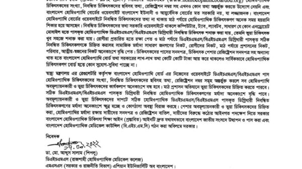 স্বাস্থ্য মন্ত্রণালয় অধিভুক্ত বাংলাদেশ হোমিওপ্যাথি বোর্ডের ওয়েবসাইটে ডিগ্রিধারী সকল রেজিস্টার্ড হোমিওপ্যাথিক ডাক্তারদের ছবিসহ তথ্য দ্রুত অন্তর্ভুক্ত করতে বোর্ডের রেজিস্ট্রারের মাধ্যমে বোর্ড চেয়ারম্যান কে পত্র প্রদান করেছেন বিশিষ্ট কলামিস্ট ও কেন্দ্রীয়