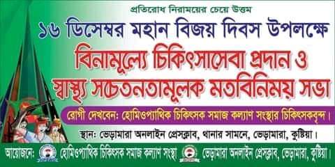 মহান বিজয় দিবস উপলক্ষে ১৬ ডিসেম্বর সকাল ৯ টা হতে ভেড়ামারা থানার সামনে (ভেড়ামারা অনলাইন প্রেসক্লাব এর সামনে) বিনামূল্যে ঔষধসহ রুগী দেখা হবে। আগ্রহীরা সকাল ৯ টার সময় আসার অনুরোধ
